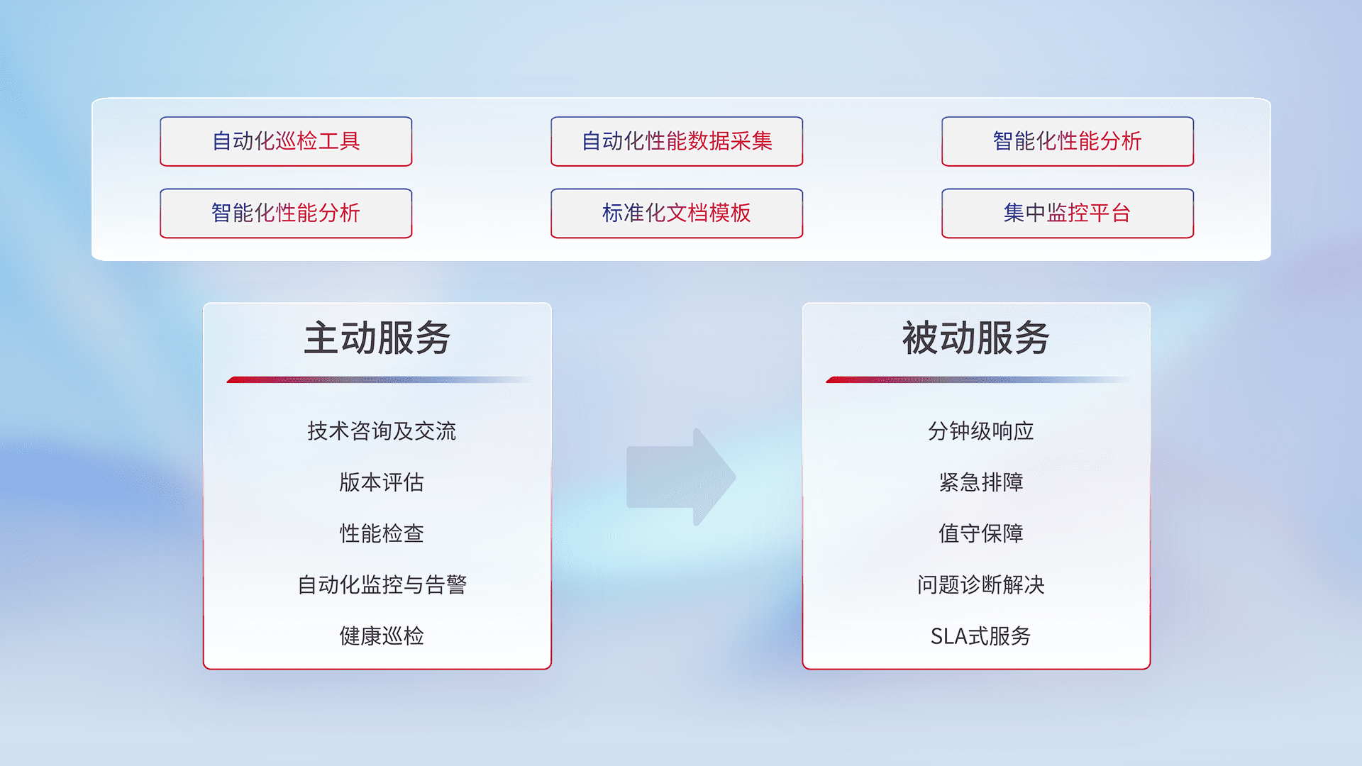 智能化工具和标准化文档,,,,保障服务质量,,,,提供主动服务(包含技术咨询、、版本评估、、、、性能检查、、、自动化监控与告警、、健康巡检)和被动服务包含(分钟级响应、、、紧急排障、、值守保障、、、问题诊断解决、、、SLA服务)。。。